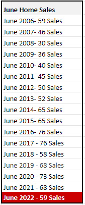 Despite these luxury home sales in June, the median sales price for June was $370,000 up from $360,000 in May. We remarked on this trend in last month’s post that during April the median price was $400,000 which stands so far as the high point for 2022. June showed a little bounce upwards again which may be due to mortgage rates leveling off or momentum of the busy summer months, but this will be a trend to continue watching this year as talk of a housing bubble is tossed about.