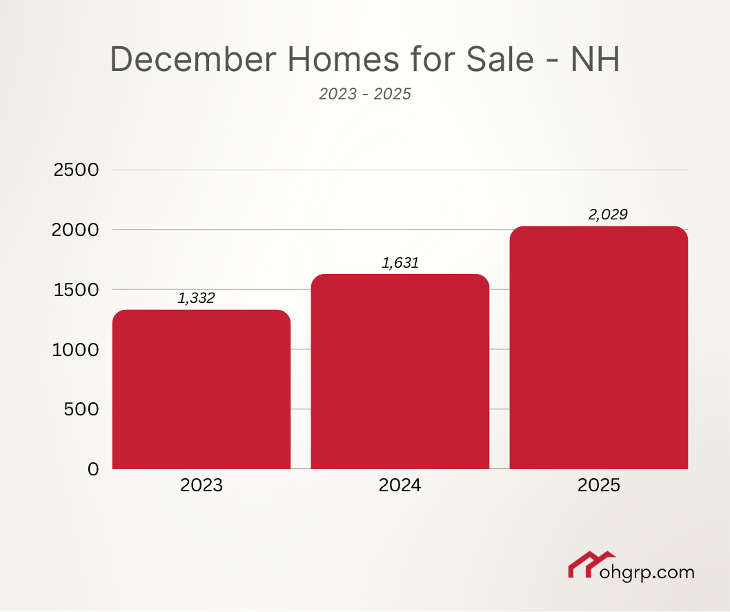 When looking at New Hampshire housing inventory for the month of December, available homes for sale increased in 2025 compared to 2024 and 2023, as shown in the accompanying chart. This is a data point we’ll continue to monitor into the first quarter of 2026.