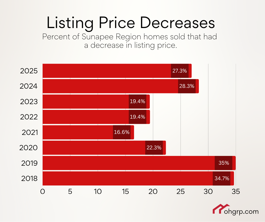 In 2025, 27% of homes sold in the Sunapee Region had a price decrease prior to sale. Of those price reductions, 61% occurred during the second half of the year, between July and December.