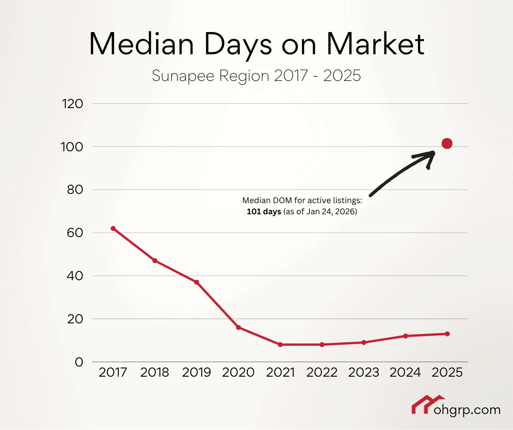 Days on Market (DOM) can be examined using two separate data sets: closed sales and active listings. In the Sunapee Region, closed sales data for 2025 shows a median DOM of 13 days for single-family homes. Homes currently listed for sale in the region show a median DOM of 101 days.